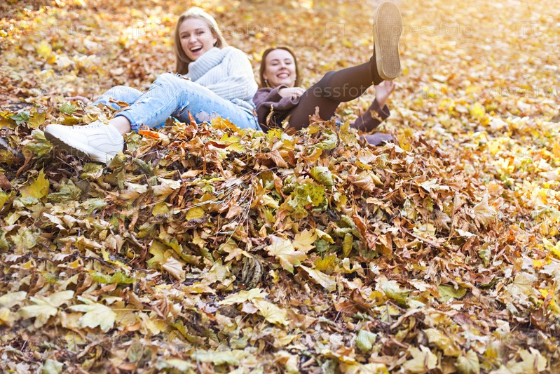 Модные красивые молодые подруги вместе на фоне осеннего парка. Веселимся и позируем