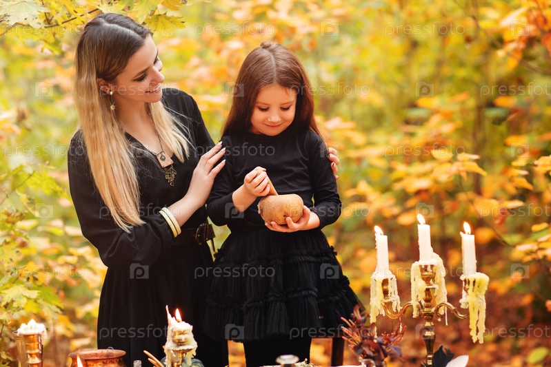 Мать и дочь готовят зелье ведьмы в день Хэллоуина