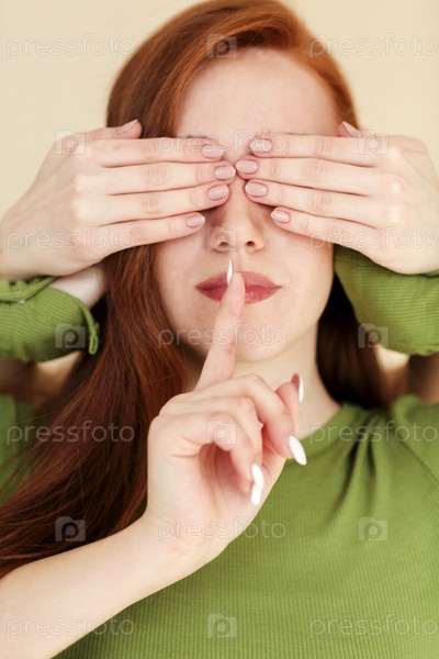 Глухая женщина с закрытыми глазами жестикулирует молчанием