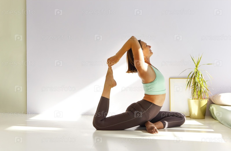 Гибкая женщина занимается йогой дома