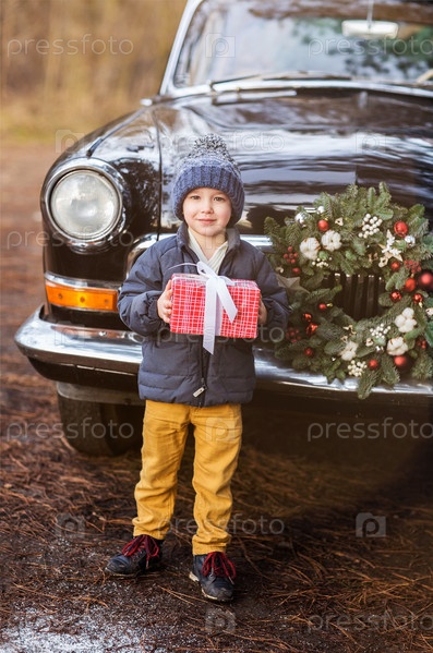 Маленький ребенок с подарками на винтажной машине в парке