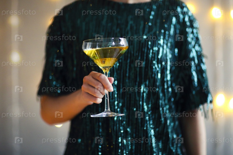 Женщина в праздничном наряде держит бокал с шампанским