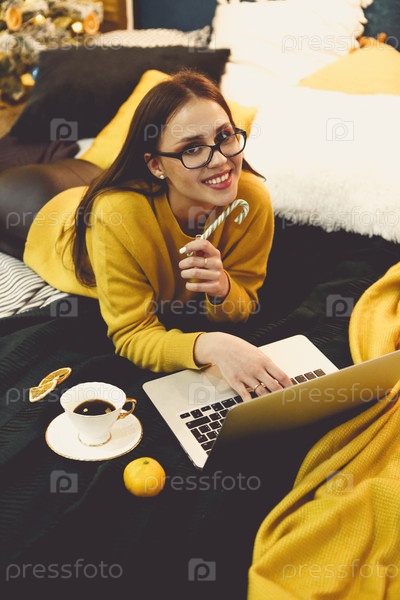 Красивая молодая женщина делает покупки онлайн на ноутбуке в уютном рождественском интерьере