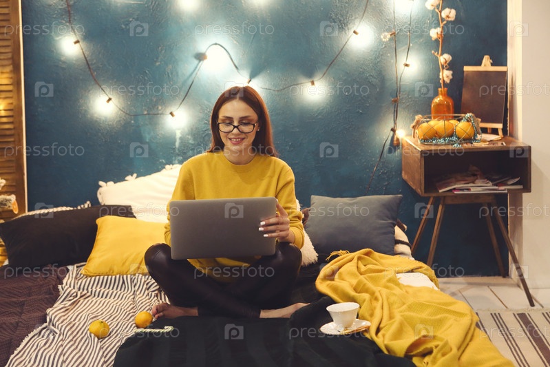 Красивая молодая женщина делает покупки онлайн на ноутбуке в уютном рождественском интерьере