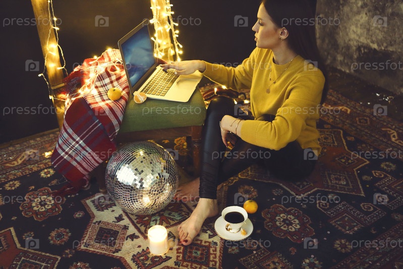Красивая молодая женщина делает покупки онлайн на ноутбуке в уютном рождественском интерьере