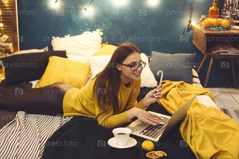 Красивая молодая женщина делает покупки онлайн на ноутбуке в уютном рождественском интерьере