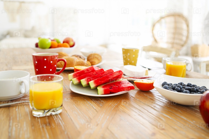 Кофе с фруктами, хлопьями и круассаном на фоне деревянного стола