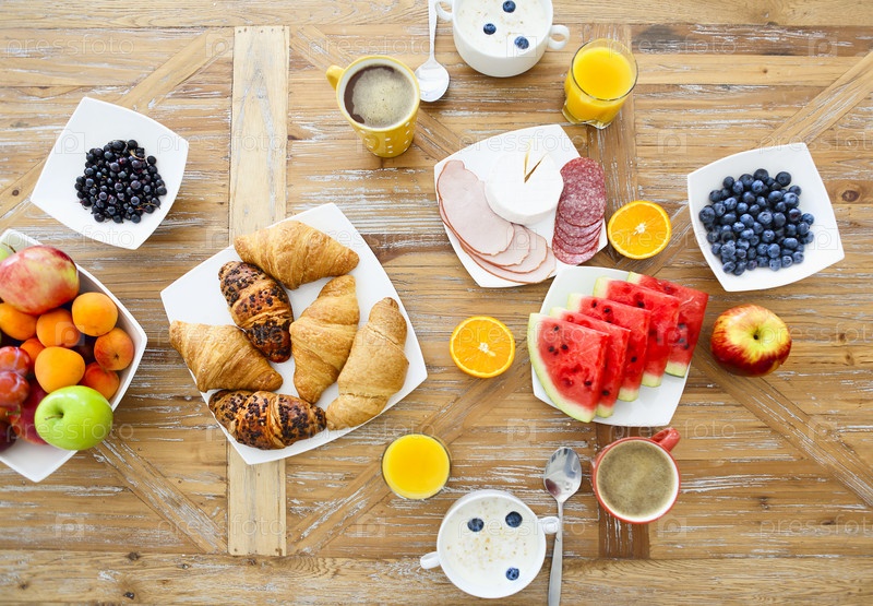 Кофе с фруктами, хлопьями и круассаном на фоне деревянного стола
