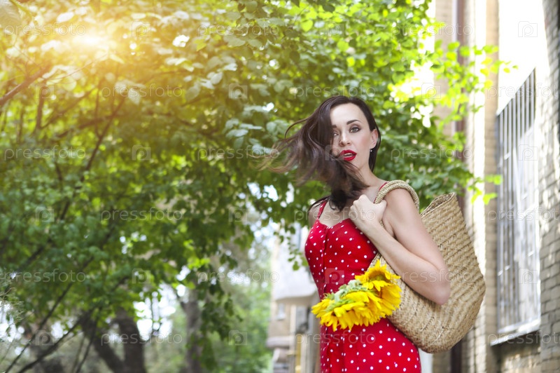 Красивая молодая женщина в красном платье в горошек держит корзину с подсолнухами