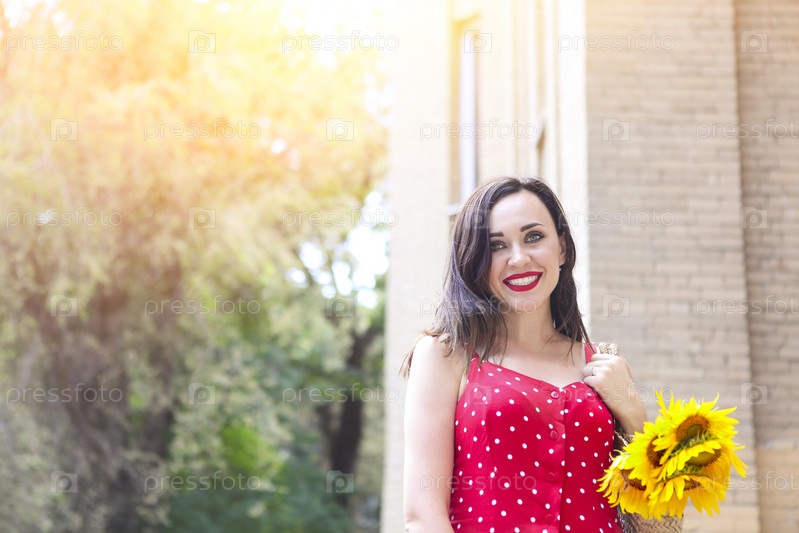 Красивая молодая женщина в красном платье в горошек держит корзину с подсолнухами
