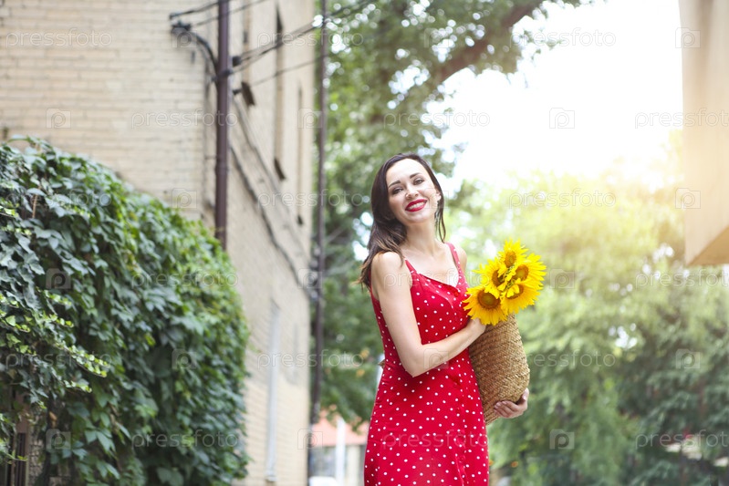 Красивая молодая женщина в красном платье в горошек держит корзину с подсолнухами