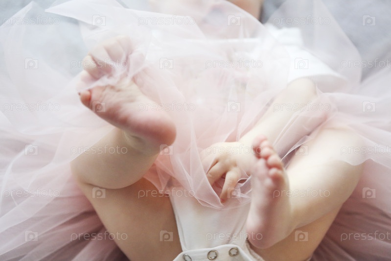 Очаровательная забавная девочка в юбке ту-ту на кровати. Крупный план ног