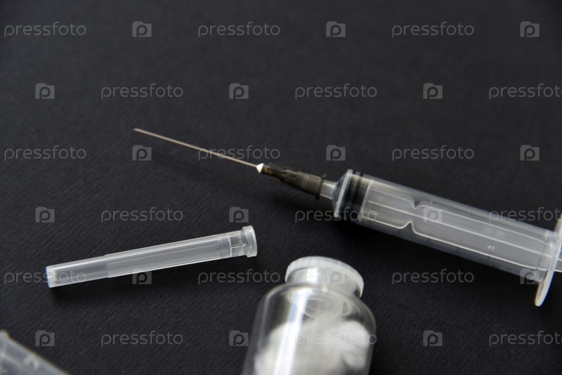 Пустой медицинский шприц и стеклянная бутылка на черном фоне
