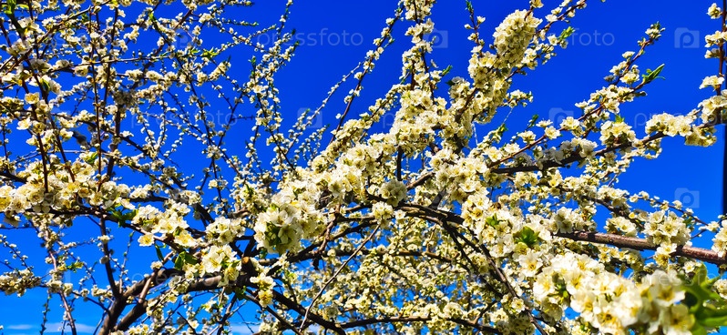 Цветущие ветви деревьев и зеленая трава ранней весной крупным планом