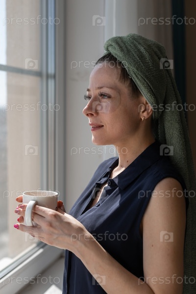 Молодая красивая девушка после душа с полотенцем на голове стоит дома, смотрит в окно и держит кружку горячего напитка. Время не одиноко. Личная гигиена