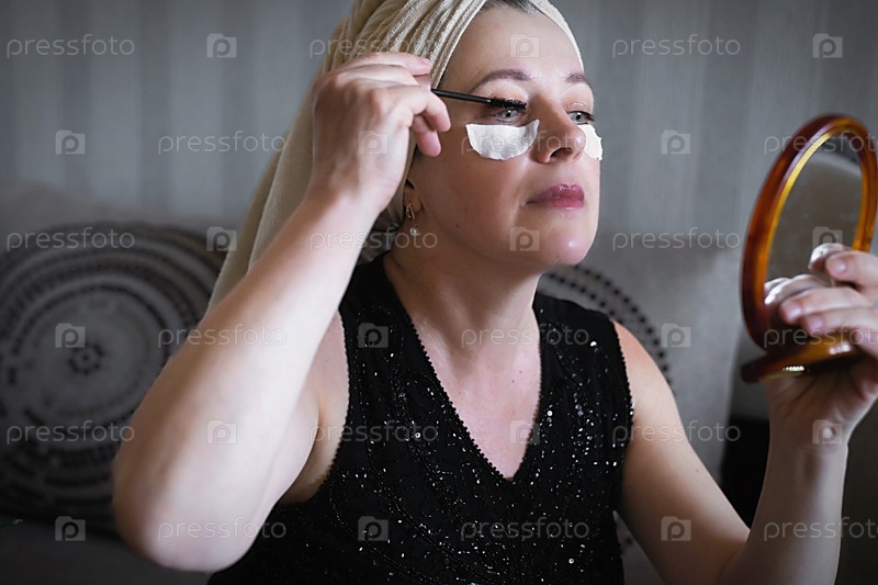 Счастливая красивая женщина средних лет смотрит в зеркало и красит глаза тушью. Концепция ухода за собой. Домашний спа и релаксация