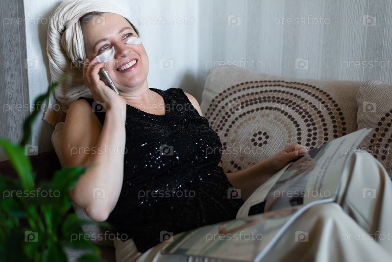 Счастливая женщина средних лет разговаривает по телефону дома на диване после душа. Концепция ухода за собой. Домашний спа и отдых. Активная жизненная позиция старшего. Современные технологии