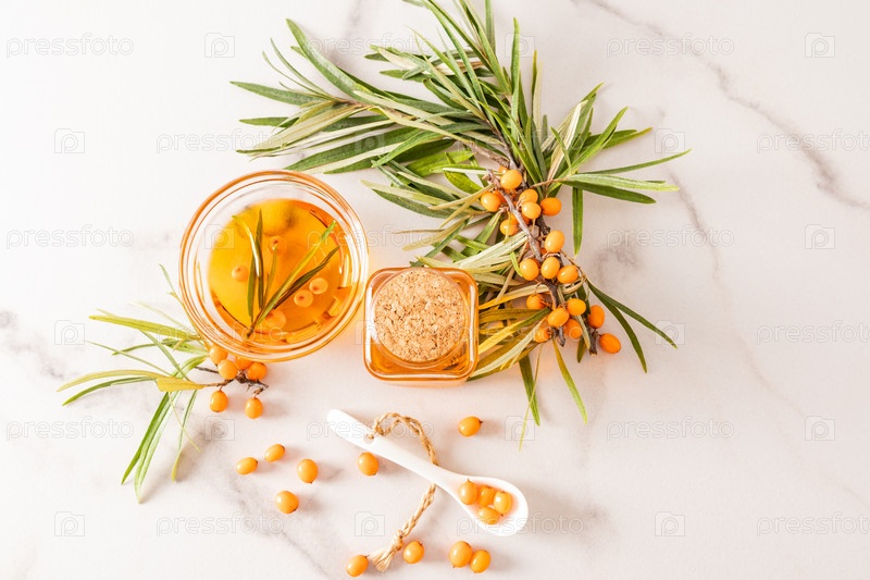Вид сверху на стеклянную бутылку с крышкой и миску, наполненную органическим маслом облепихи. веточки и ягоды на мраморном фоне. витамины