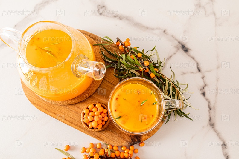 Стеклянный чайник и чашка витаминного чая из облепихи на деревянной доске и мраморный стол с ветками и ягодами облепихи. вид сверху
