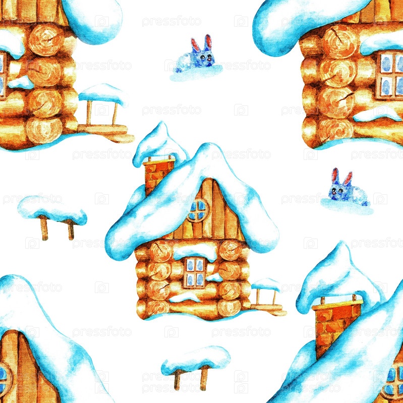 Деревянная хижина. Бесшовный узор. Акварель