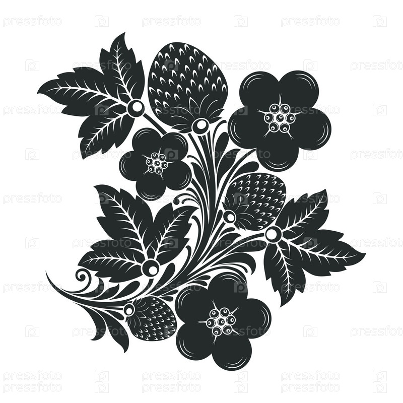 Стилизованный букет ягод и цветов с листьями, черное изолированное изображение на белом фоне. Вектор