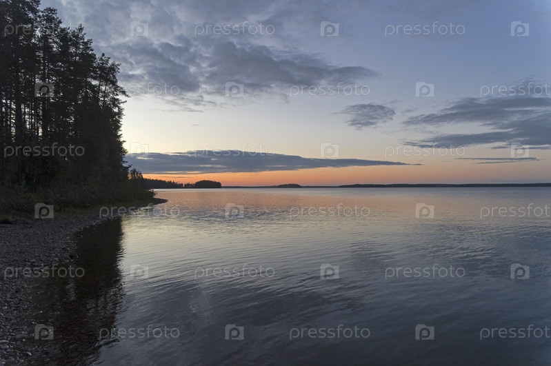 Тихий вечер на берегу озера. Озеро Пистаярви, река Писта, северная Карелия. Август