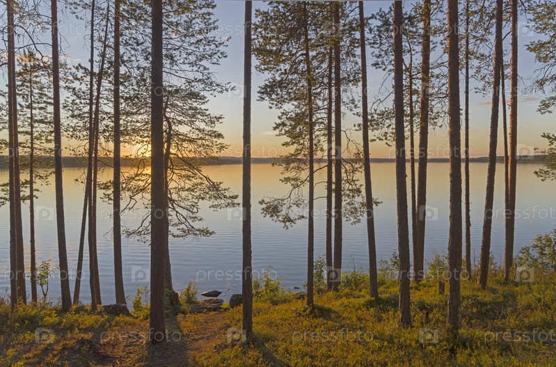 Тихий солнечный вечер на берегу озера. Озеро Вайкульское, река Писта, северная Карелия. Август