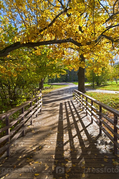 Благоустроенная пешеходная дорожка. Солнечный день в Октябре. Ландшафтный заказник Теплый Стан, Москва, Россия,