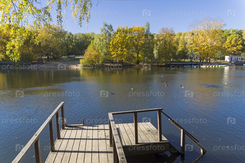 Красивый осенний пейзаж - деревья с ярко-желтыми осенними листьями на берегу пруда. Ландшафтный заказник Теплый Стан, Москва, Россия. Солнечный день в октябре