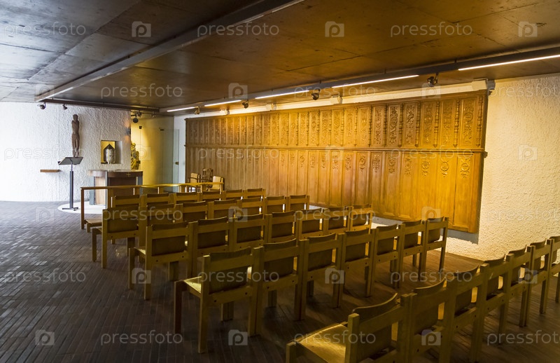 Интерьер современной католической церкви. Стулья для прихожан в Церкви Жанны д`Арк. Руан, Нормандия, Франция
