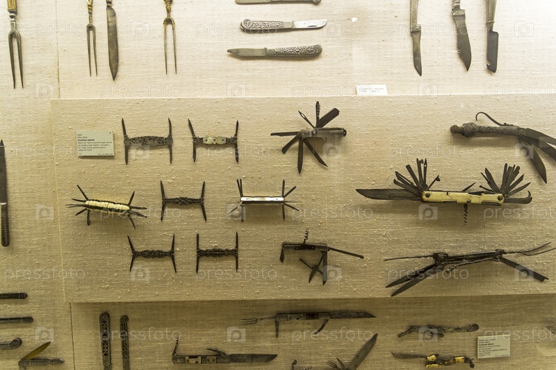 Старые раскладные перочинные ножи в витрине музея. 18-19 век. Руан, Франция