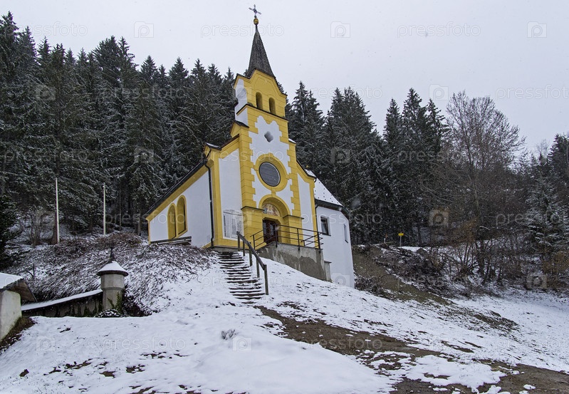 Маленькая часовня в лесу на склоне горы. Долина Циллерталь, над городком Целль-ам-Циллер, Тироль, Австрия