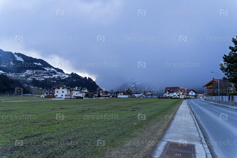Туча накрывает горную долину. Горнолыжный курорт Целль-ам-Циллер, Тироль, Австрия. Солнечный день в марте