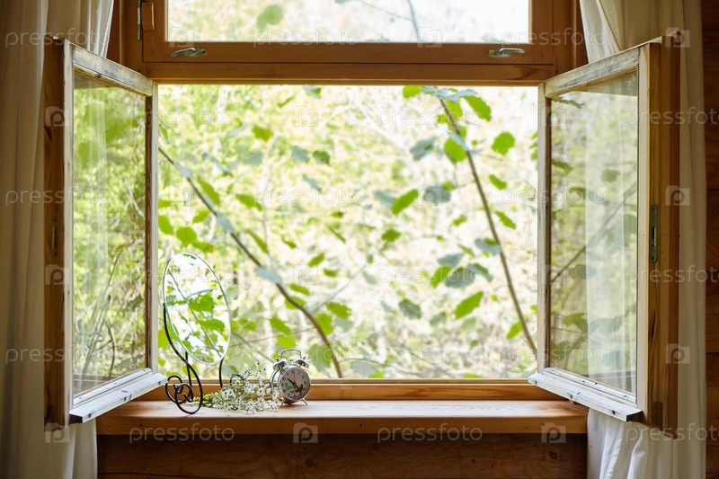 Открытое окно деревянного дома из бревен