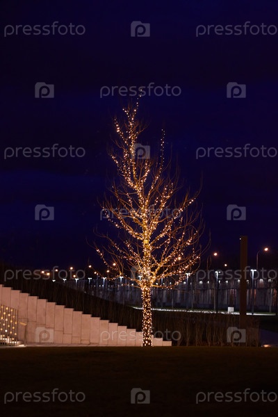 Деревья украшены огоньками из маленьких электрических лампочек. Ночное освещение городских улиц
