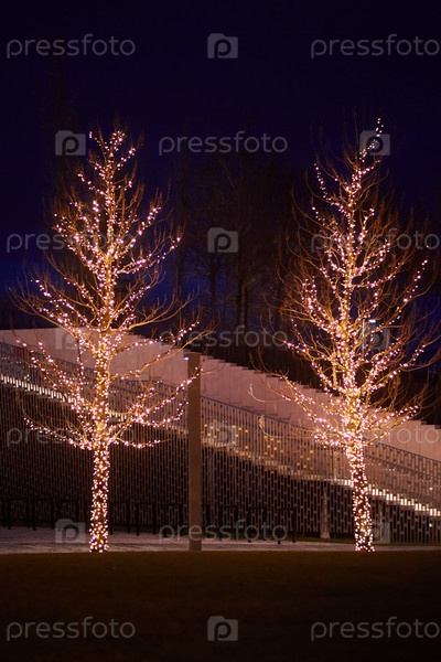 Деревья украшены огоньками из маленьких электрических лампочек. Ночное освещение городских улиц