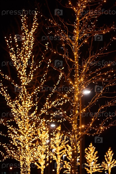 Деревья украшены огоньками из маленьких электрических лампочек. Ночное освещение городских улиц