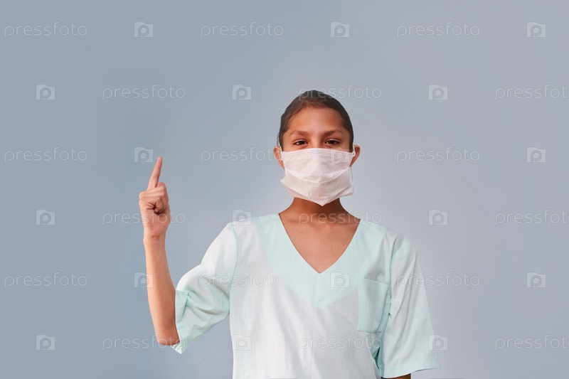 В кадр смотрит молодая медсестра или ассистент в медицинской одежде и маске