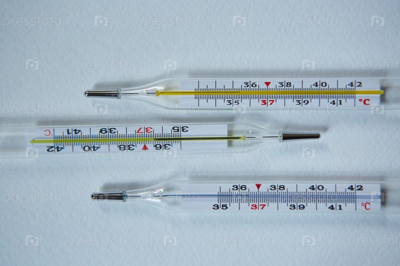 Три классических ртутных термометра со шкалой градусов Цельсия лежат на чистом белом фоне. Концепция выздоровления от инфекции и коронавируса