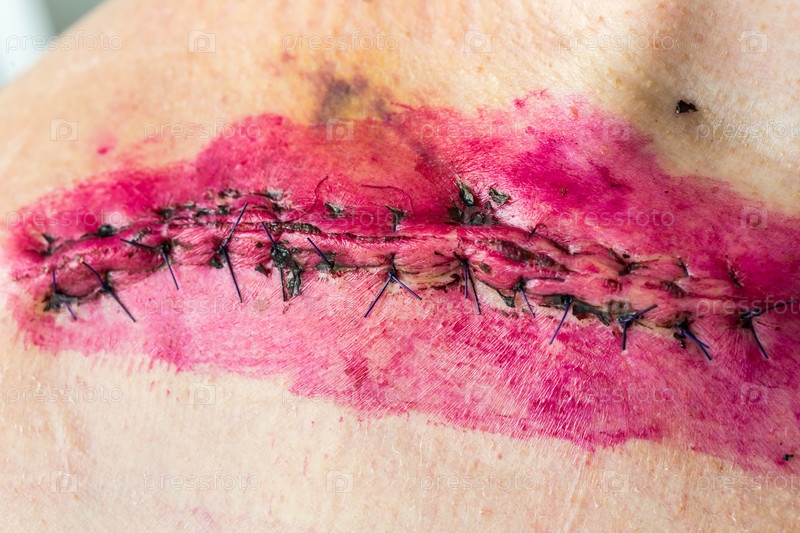 Шовная рана, обработанная фукорцином, после перелома правой ключицы