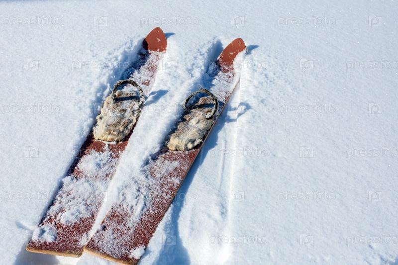 Пара старомодных деревянных красных лыж на белом снегу