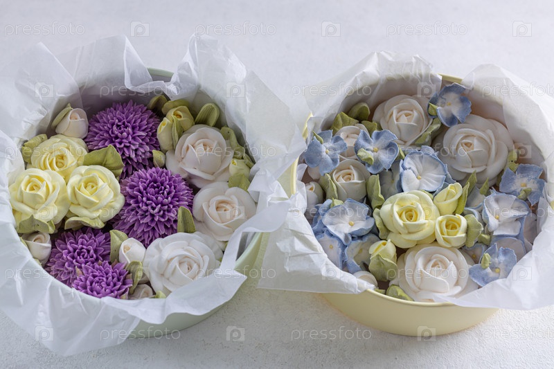Зефирный букет цветов в подарочной коробке на светлом фоне, вид сверху, праздничная концепция, День святого Валентина
