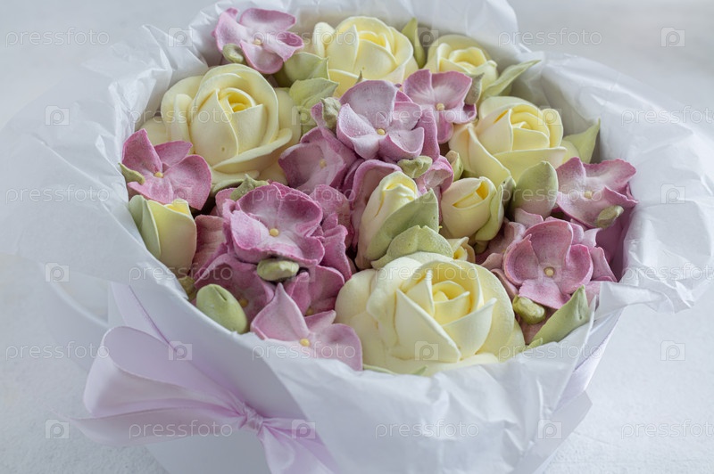 Зефирный букет цветов в подарочной коробке на светлом фоне, праздничная концепция