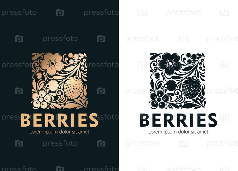 Ягоды и цветы, монохромная эмблема, логотип квадратной формы. Вектор