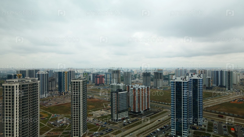 Строительная площадка нового городского квартала. Строительство многоэтажных домов. Пасмурная погода. Аэрофотосъемка