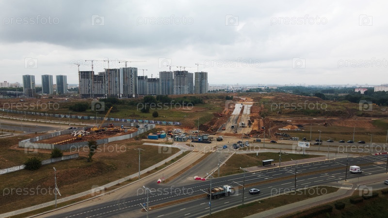 Строительная площадка нового городского квартала. Строительство многоэтажных домов. Пасмурная погода. Аэрофотосъемка