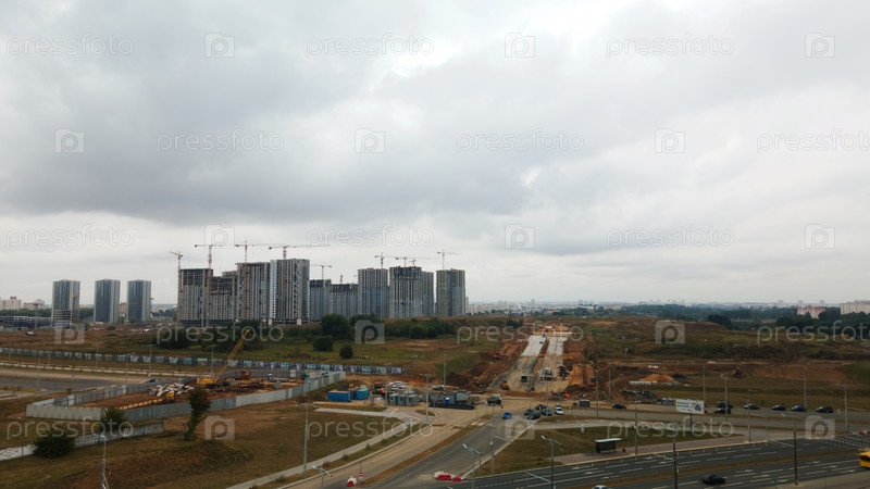 Строительная площадка нового городского квартала. Строительство многоэтажных домов. Пасмурная погода. Аэрофотосъемка