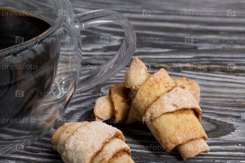 Рулетики с корицей. Они лежат на блюдце. Рядом стоит чашка кофе. Фон из черных сосновых досок. Снято крупным планом