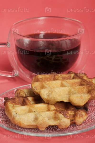 Пышные вафли. Они лежат на блюдце. Рядом с чашкой кофе. Фон розовый. Снято крупным планом