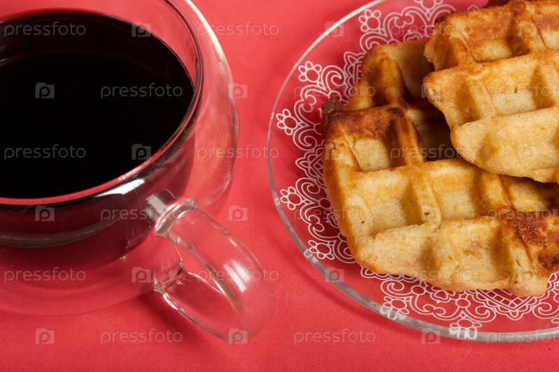 Пышные вафли. Они лежат на блюдце. Рядом с чашкой кофе. Фон розовый. Снято крупным планом